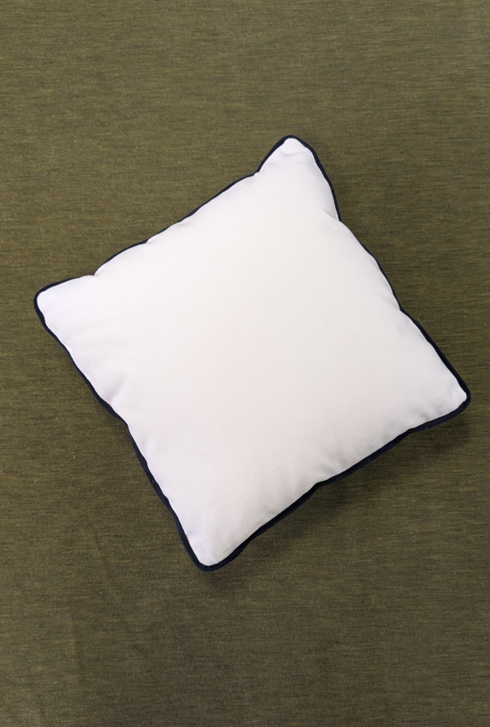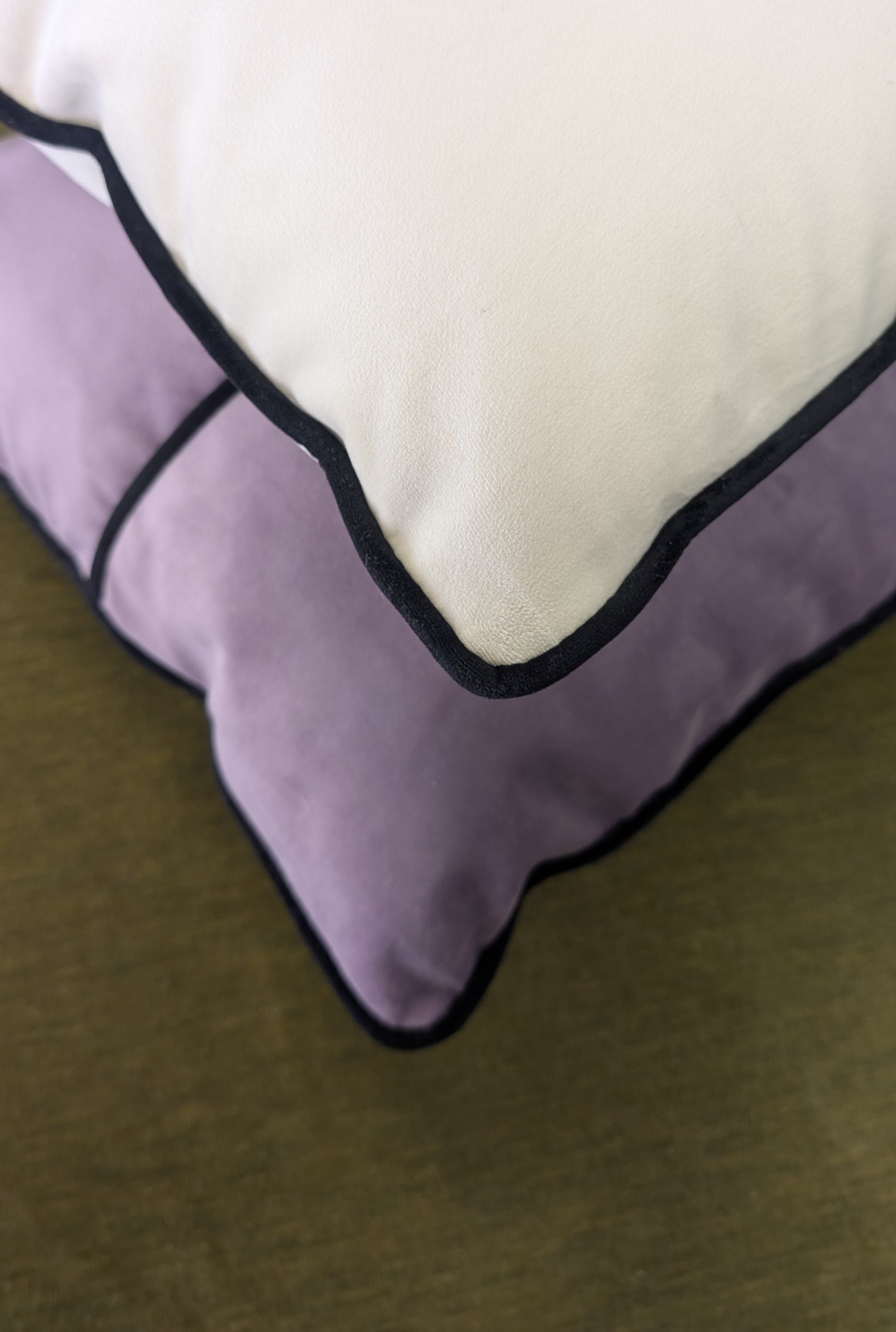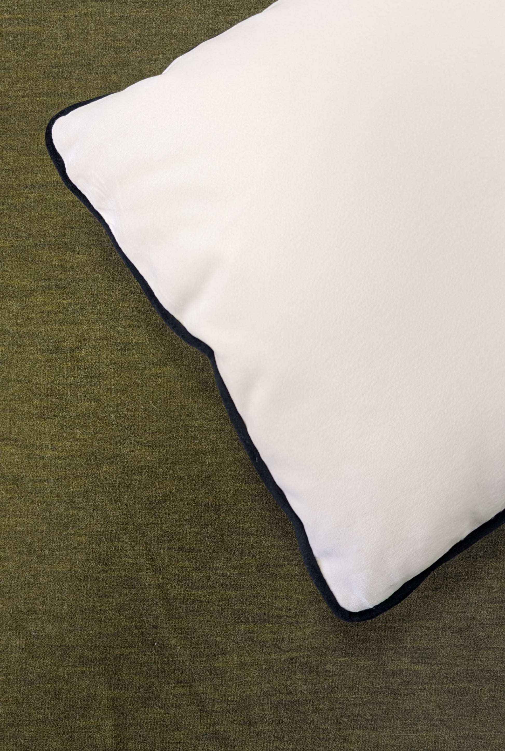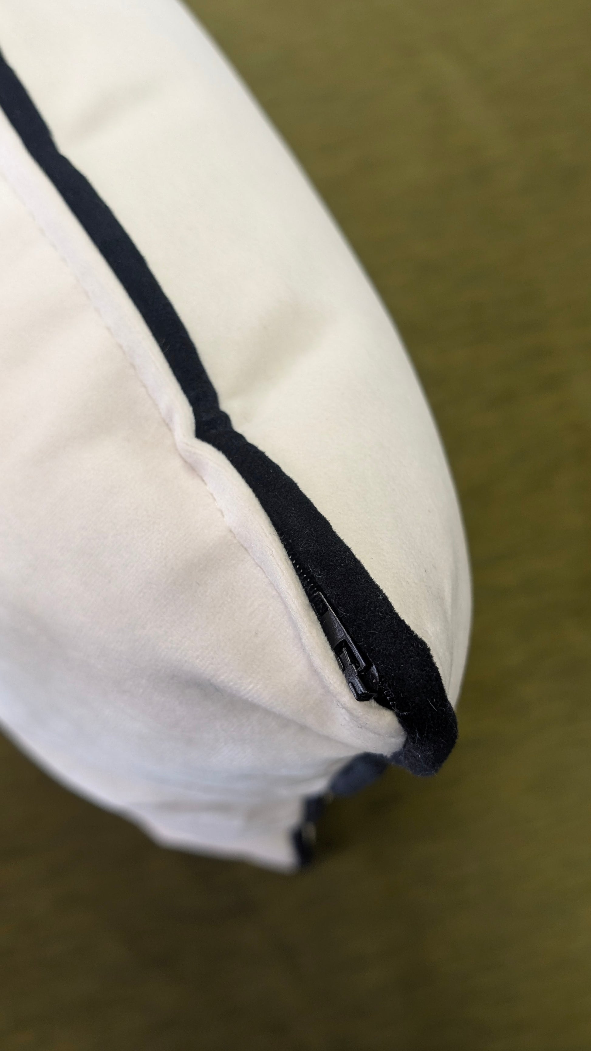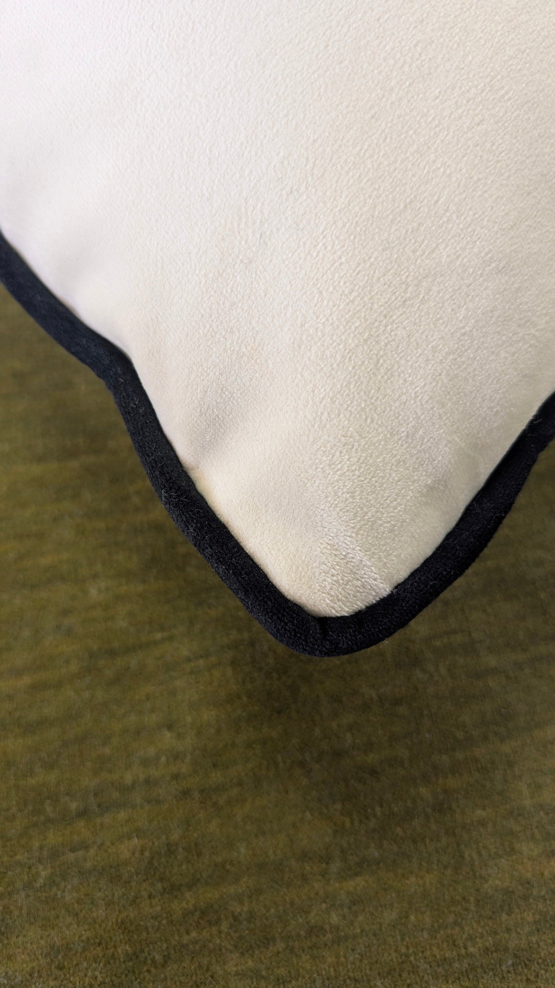 Cojín de terciopelo anti manchas en tono ecru con vivo de terciopelo en negro. Relleno de algodón sintético incluido.