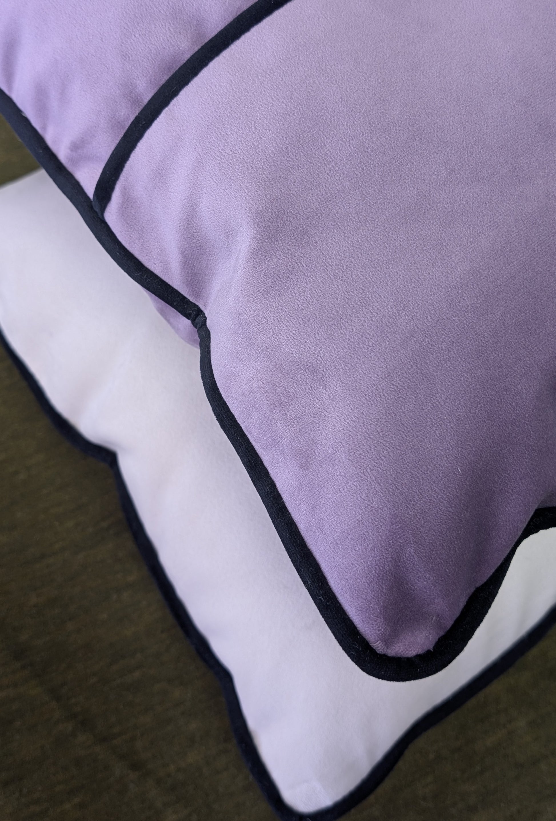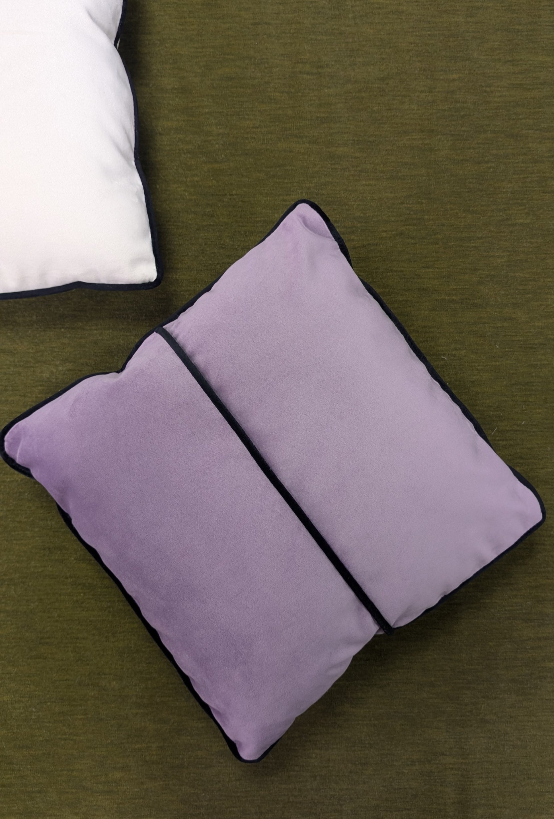 Cojín de terciopelo anti manchas en tono malva, con vivo perimetral de terciopelo en negro y detalle central. Relleno de algodón sintético incluido.