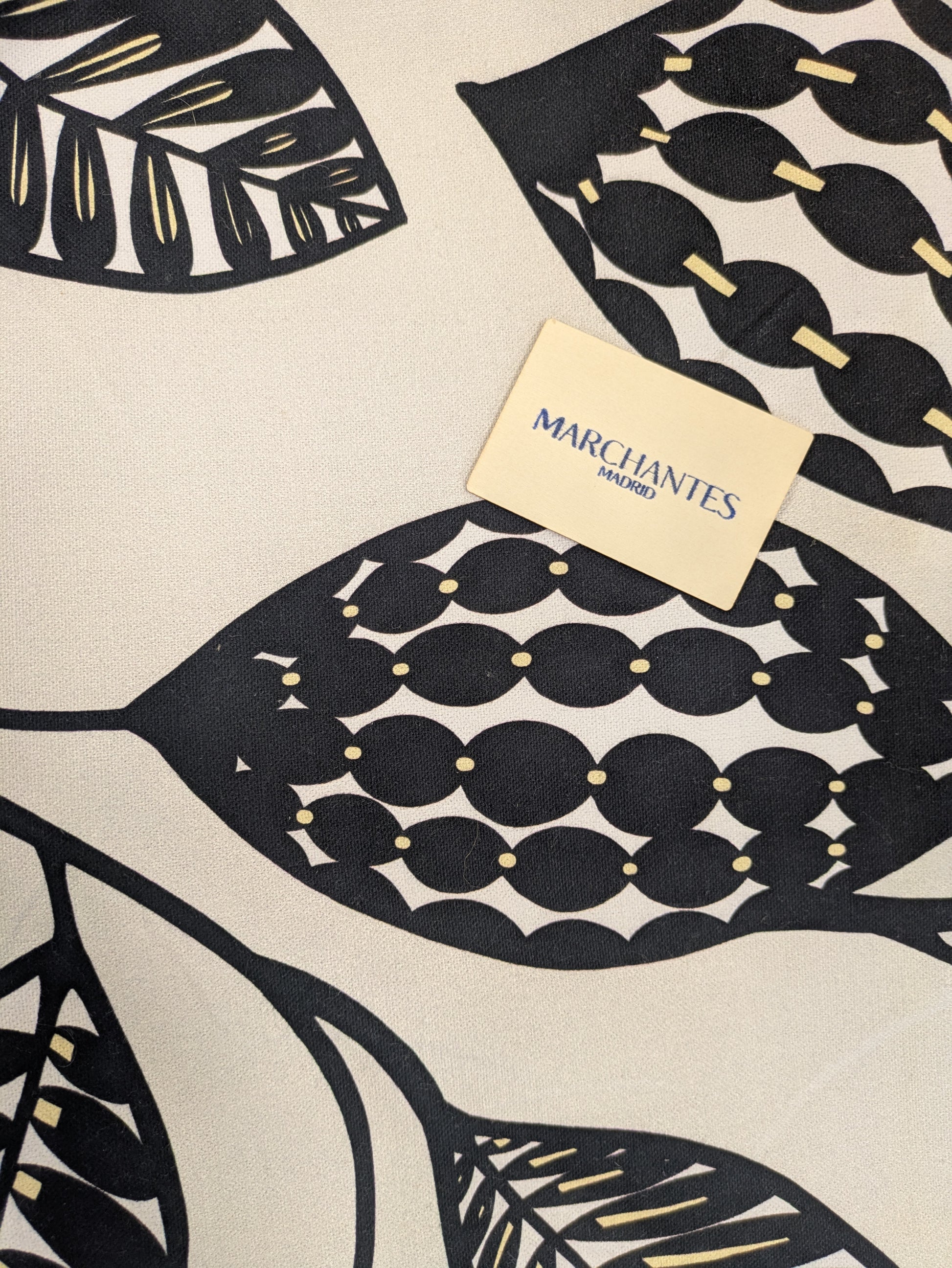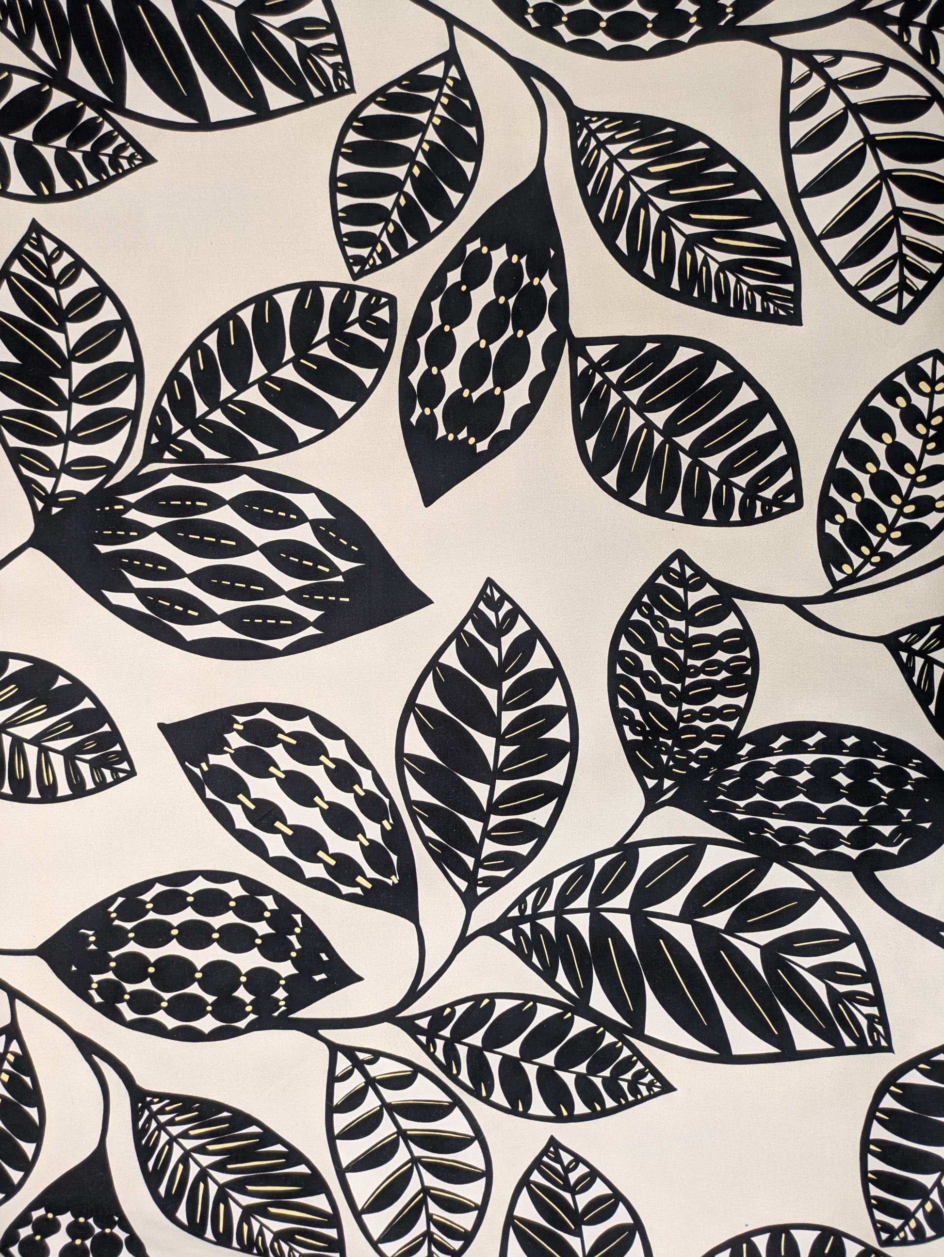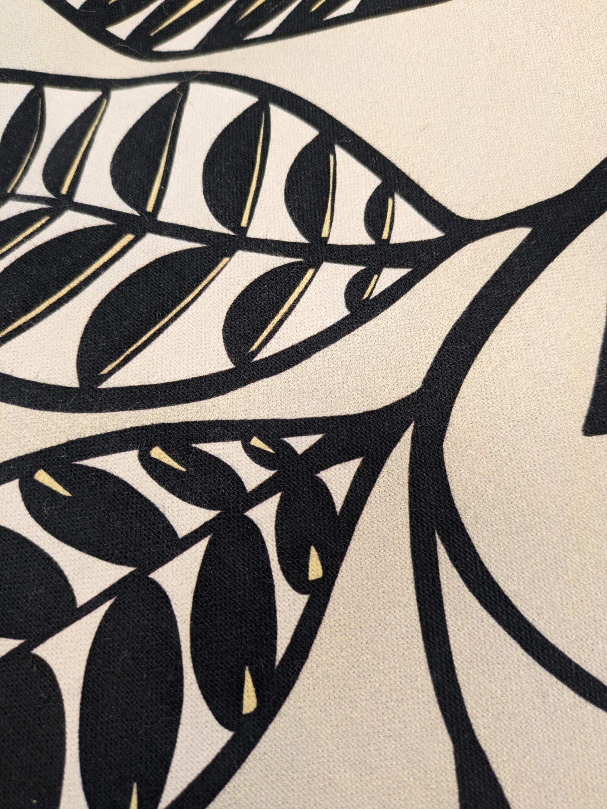 Estampado vegetal negro con pinceladas en amarillo sobre fondo crudo. Inspirado en el Folk Art escandinavo, añade un toque alegre a cualquier espacio por su dinamismo y contraste.